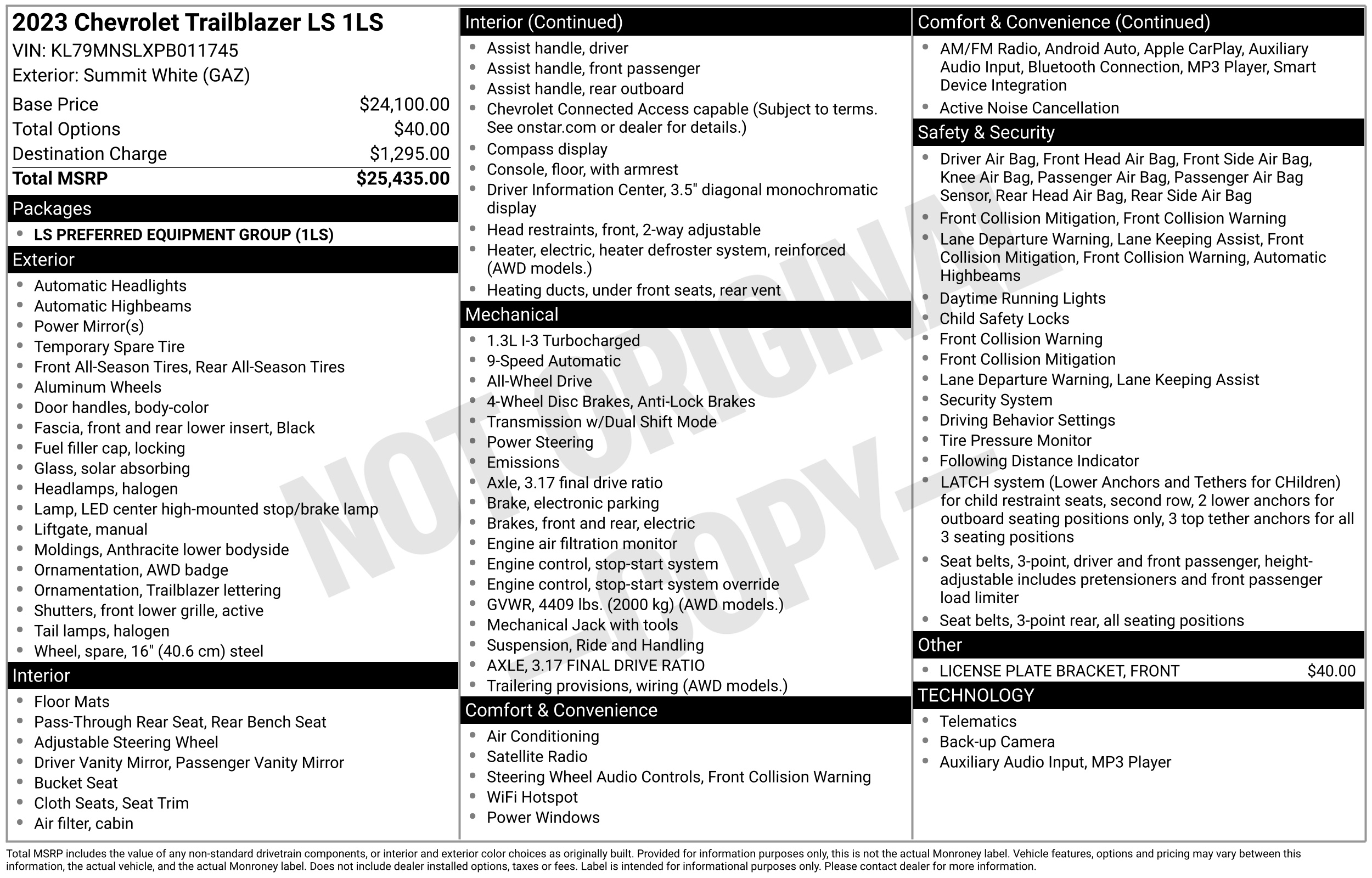 Get ready to hit the road in style with this eye-catching 2023 Chevrolet TrailBlazer! This sporty SUV is equipped with a powerful yet fuel-efficient Engine$COMMA ECOTEC 1.3L I3 Turbo DOHC SIDI with Variable Valve Timing, making every drive a thrilling experience. With its all-wheel drive system, you can conquer any road with confidence, while the suspension provides a smooth and comfortable ride. Step inside and you'll find a spacious interior with convenient features like a 7 color touchscreen display, Wi-Fi hotspot capability, and a 6-speaker audio system for all your entertainment needs. Plus, stay comfortable with the single-zone electronic air conditioning and heated electric defroster system. Safety is a top priority with features like Teen Driver mode, Following Distance Indicator, Rear Vision Camera, and multiple airbags throughout the cabin. And with the included Carfax report, you can hit the road with peace of mind knowing the vehicle's history. Whether you're running errands around town or taking a road trip, this Chevrolet TrailBlazer is ready for all your adventures. Don't miss out on this opportunity to drive home in a reliable and stylish SUV today!previously rental vehicle Visit Car2Sell online at car2sell.us to see more pictures of this vehicle or call us at 888-703-0003 today to schedule your test drive.We Finance Good and Bad credit. Warranty available. Prices include(s) all costs to be paid by a consumer except for licensing costs registration fees taxes and delivery charges.